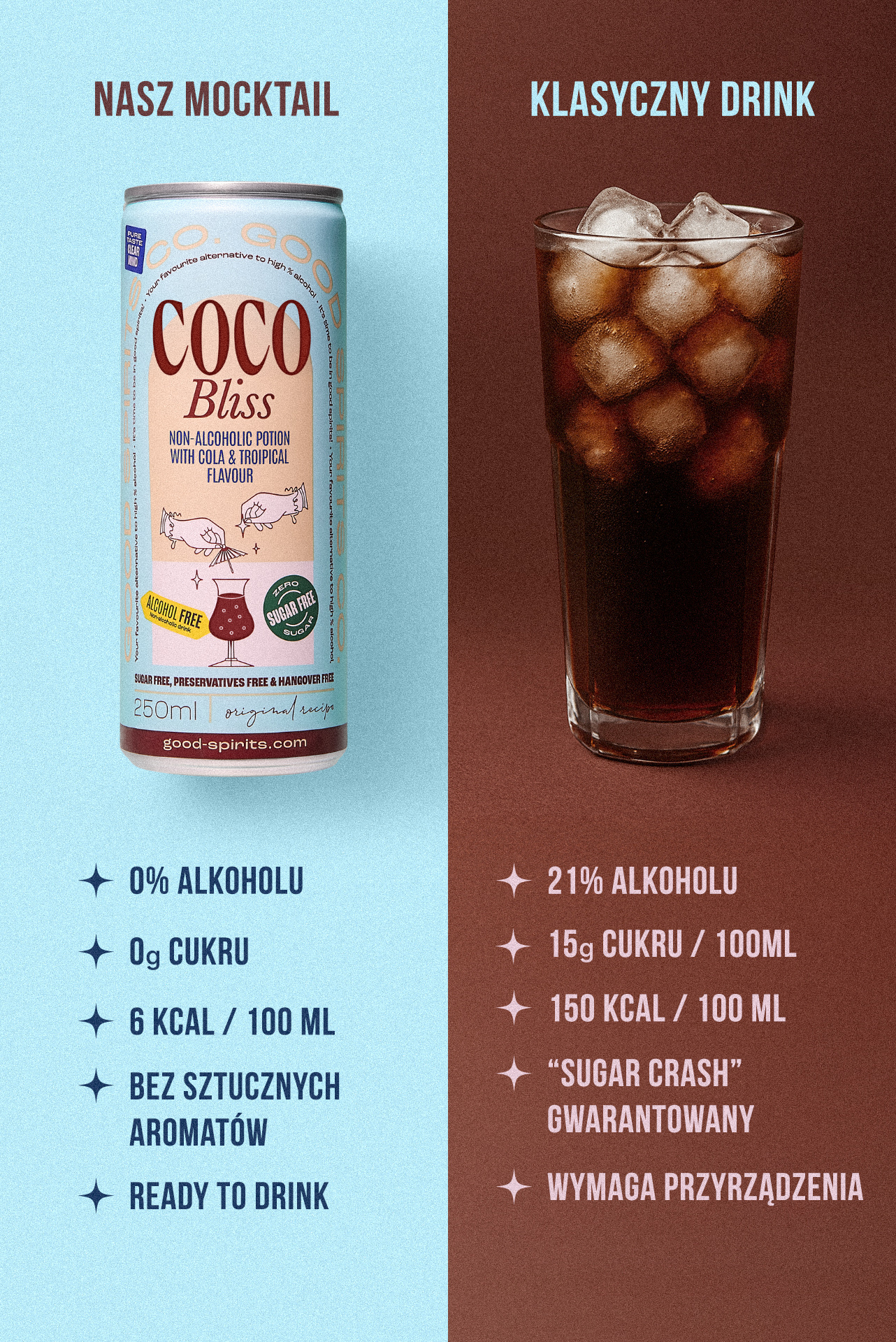 To idealna propozycja dla tych, którzy cenią egzotyczne smaki i orzeźwienie w jednym. Dla wielbicieli słodkich drinków na bazie coli, którzy nie chcą negatywnych konsekwencji wynikających z ich spożywania. Malibu Bliss to 0% alkoholu, 0g cukru oznacza przyjemność bez skutków ubocznych i klarowną głowę następnego dnia.