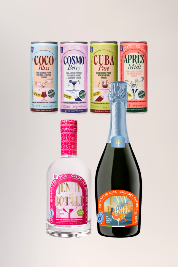 Zestaw na długi weekend w większym wydaniu: Jenny in the Bottle klasyczna i różana, dwie butelki bąbelków i kuferek z pełnym przekrojem naszych mocktaili. Na garden party, brunch, wyjazd za miasto i wszystkie te momenty, które zasługują na coś wyjątkowego bez %.
